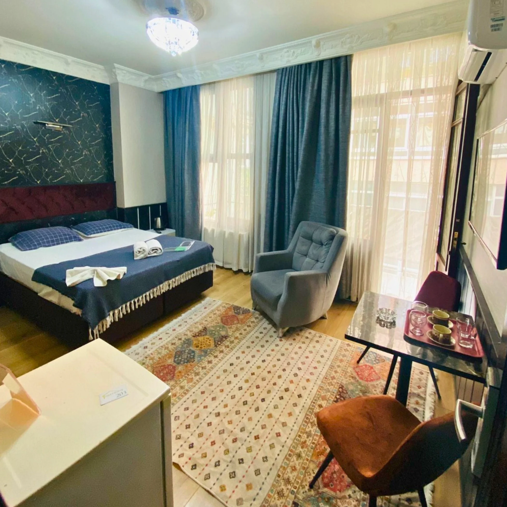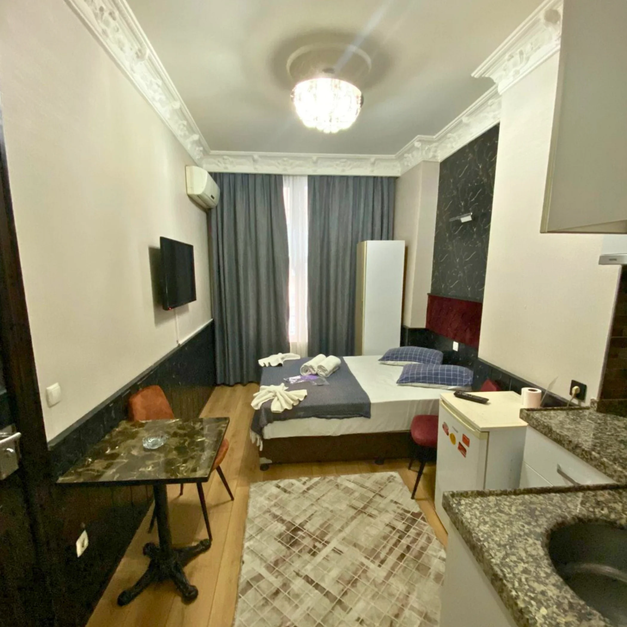 Odanın dekorasyonu çok şık ve modern, kendinizi özel hissettiren bir atmosferi var. Minimalist tasarım ama her ihtiyacınızı karşılıyor. Küçük detaylara verilen özen gerçekten takdir edilesi